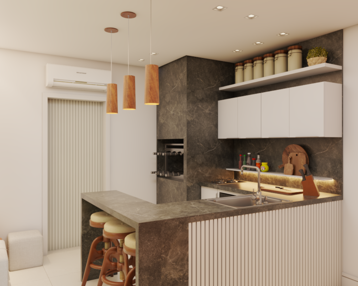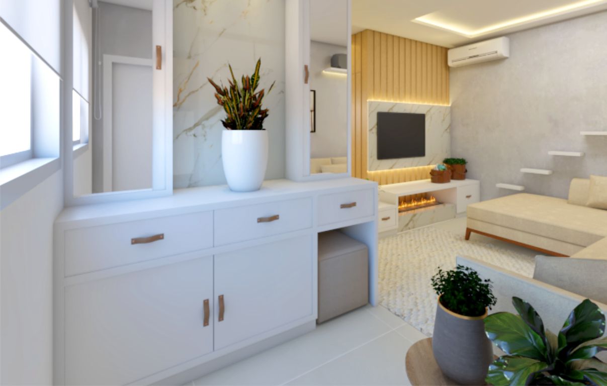 Aqui projetaremos todos os ambientes internos, incluindo móveis, iluminação, decoração, revestimentos…