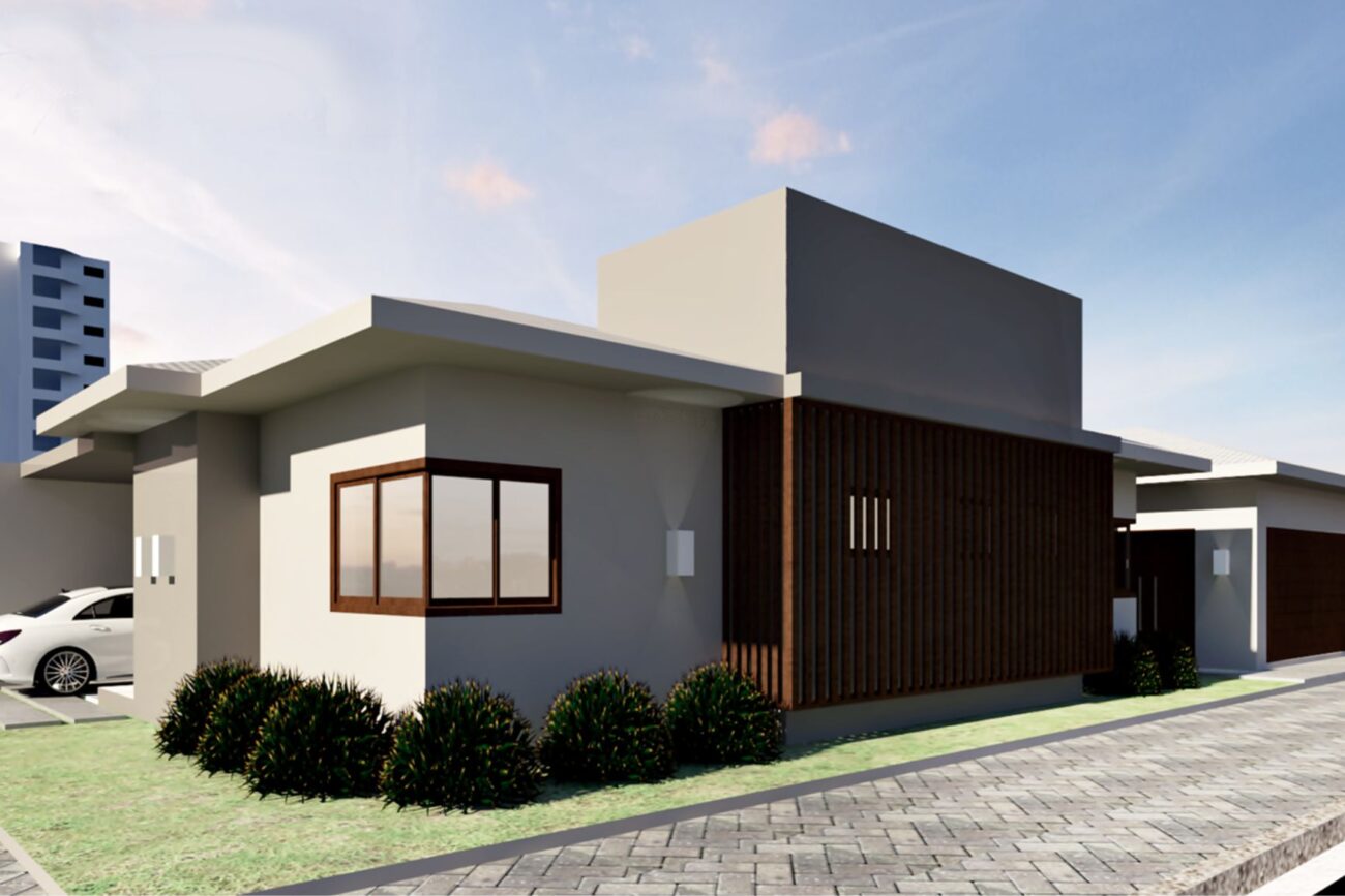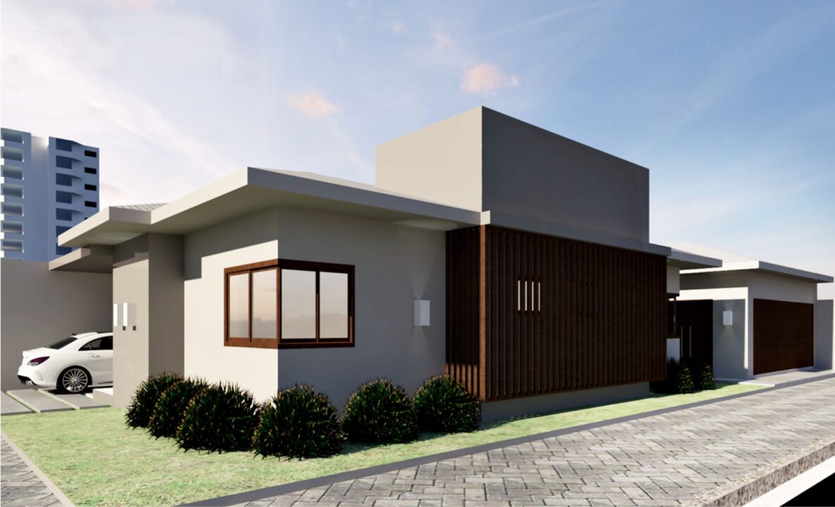 O grande desafio aqui foi a criação de uma garagem para quatro carros, um sonho do nosso cliente, com espaço para churrasco. Além disso, a casa conta com sala de estar/jantar, cozinha, lavanderia, dois dormitórios, sendo uma suíte com closet e outros dois banheiros, tudo isso em um terreno estreito.