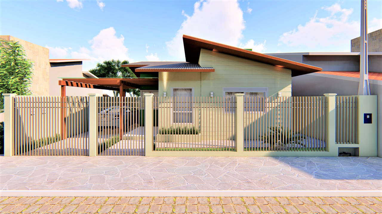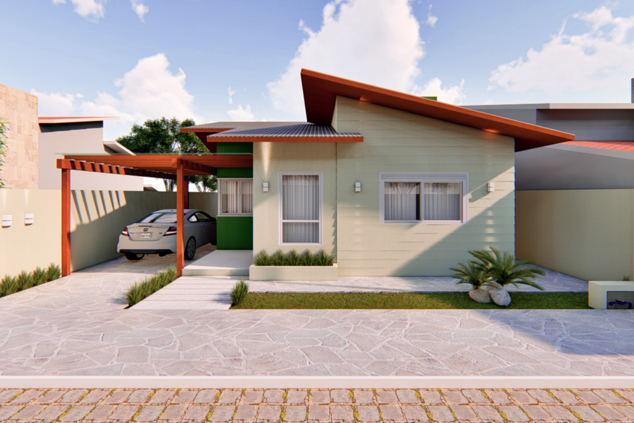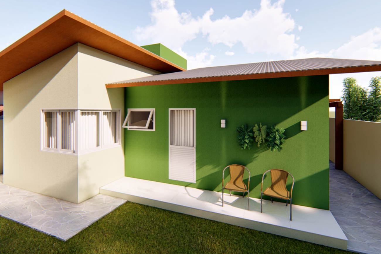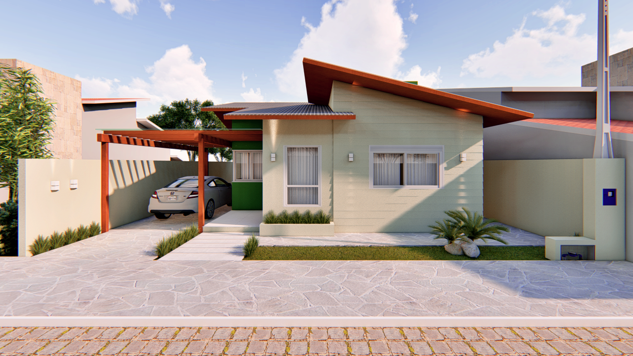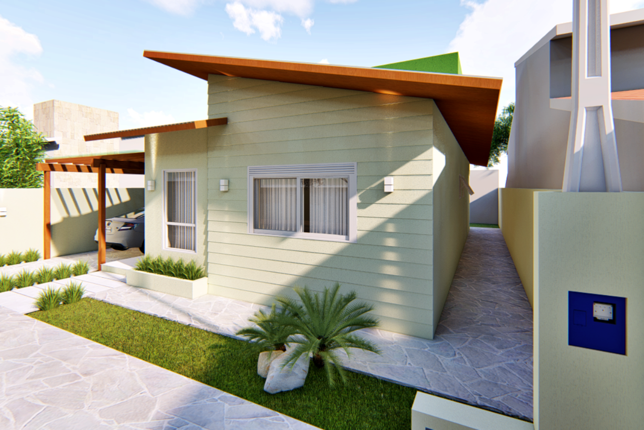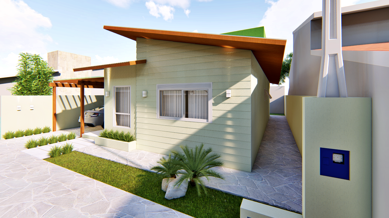 Assim, criamos um projeto que atendesse a esta necessidade e que ainda assim ficasse com “cara de casa”, transmitindo um clima aconchegante, através do telhado tradicional, a floreira na fachada e o pergolado em madeira.