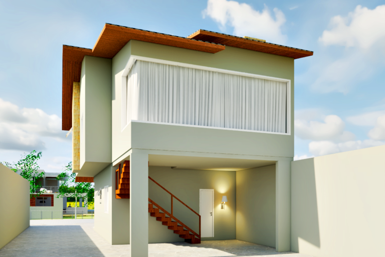 Agora, com a inclusão de um 2º andar, a nossa cliente terá uma casa muito mais espaçosa, confortável e funcional, contando com dois dormitórios, um banheiro, cozinha, sala de estar, sacada e espaço gourmet no novo pavimento.
