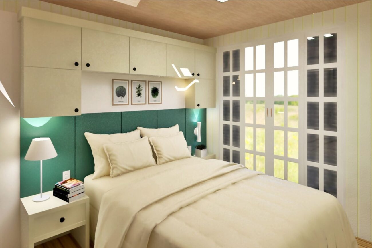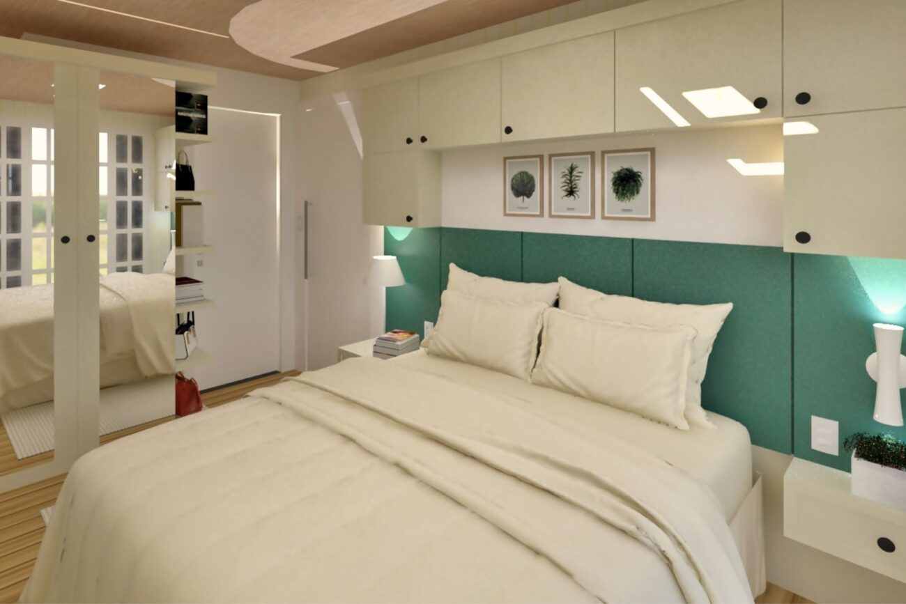 Este dormitório é todo clean com um toque de verde, a cor favorita da cliente, porque estes detalhes são importantes!