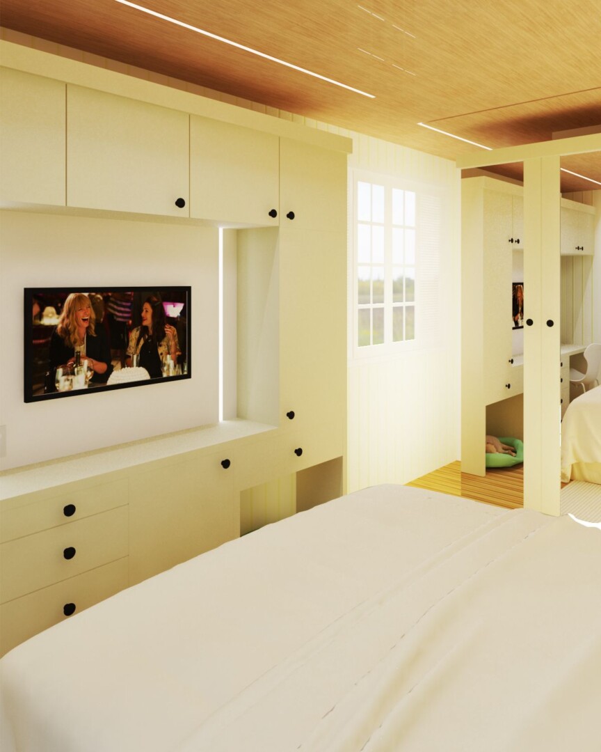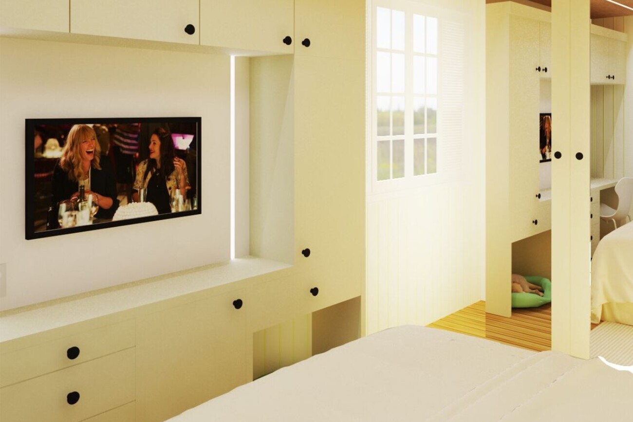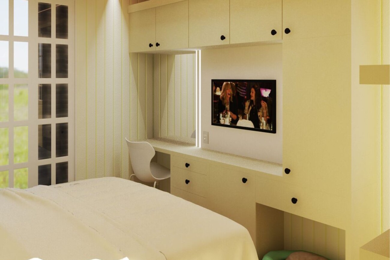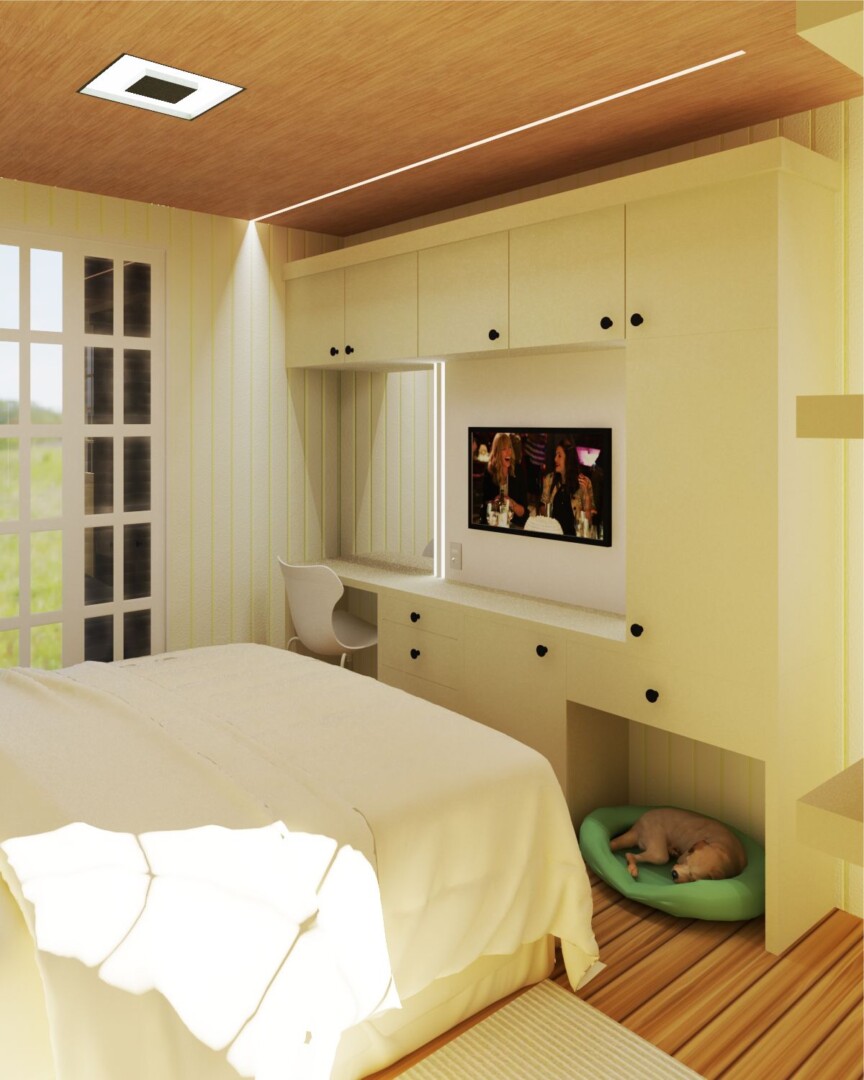 O objetivo aqui era fazer o máximo de marcenaria possível em um espaço estreito que tínhamos disponível. No teto aplicamos um novo forro vinílico com fitas de LED embutidas, iluminando o espaço de guarda-roupas e o corredor aos pés da cama.