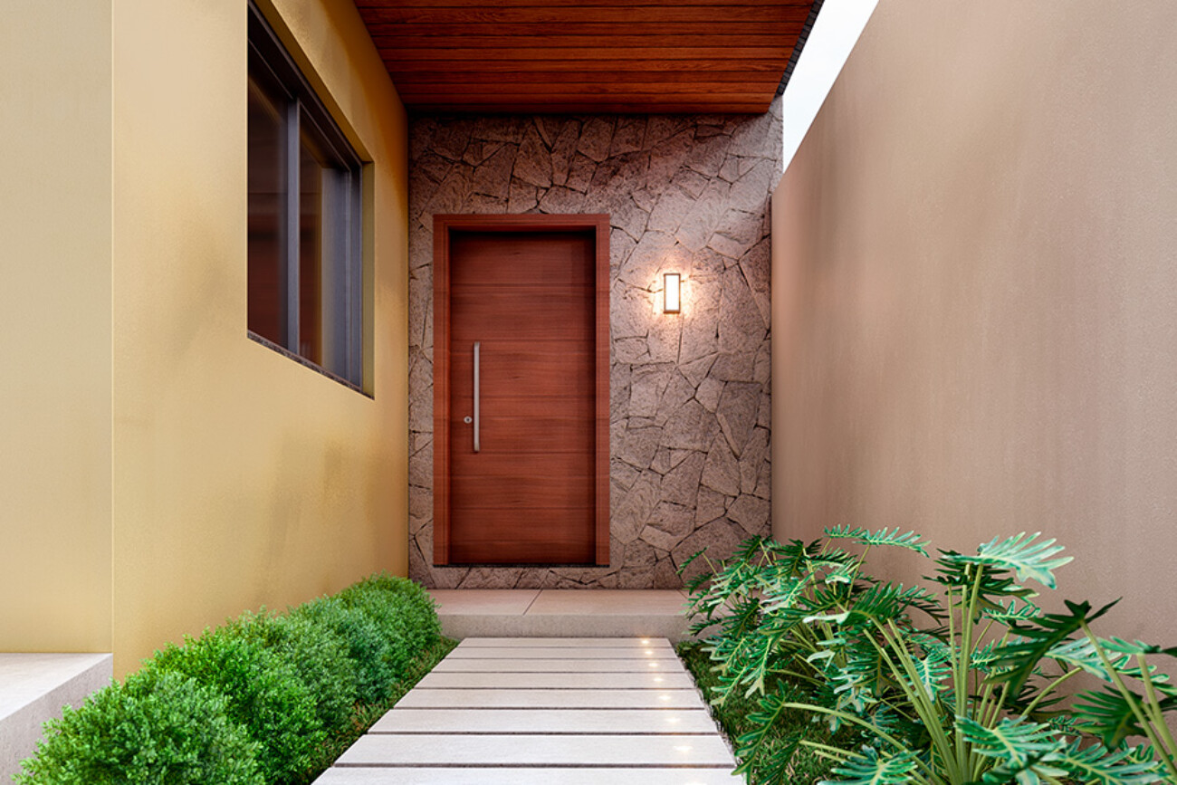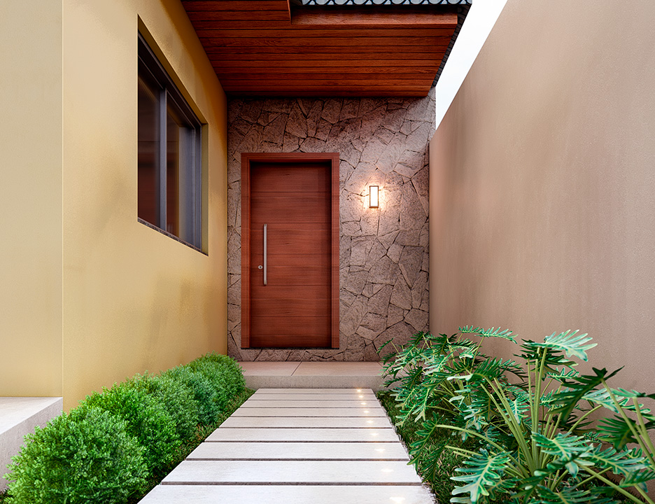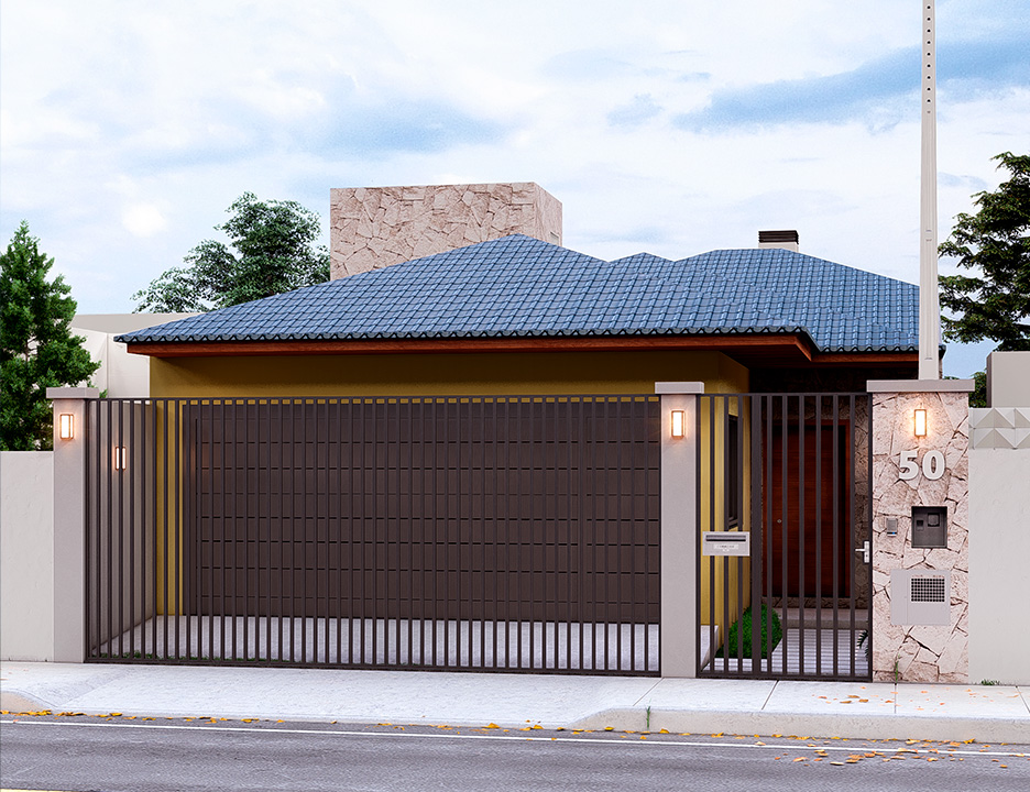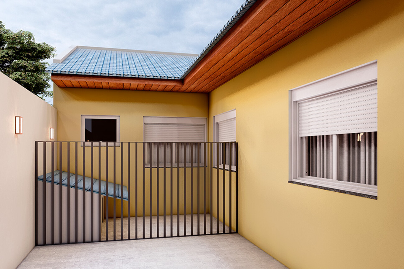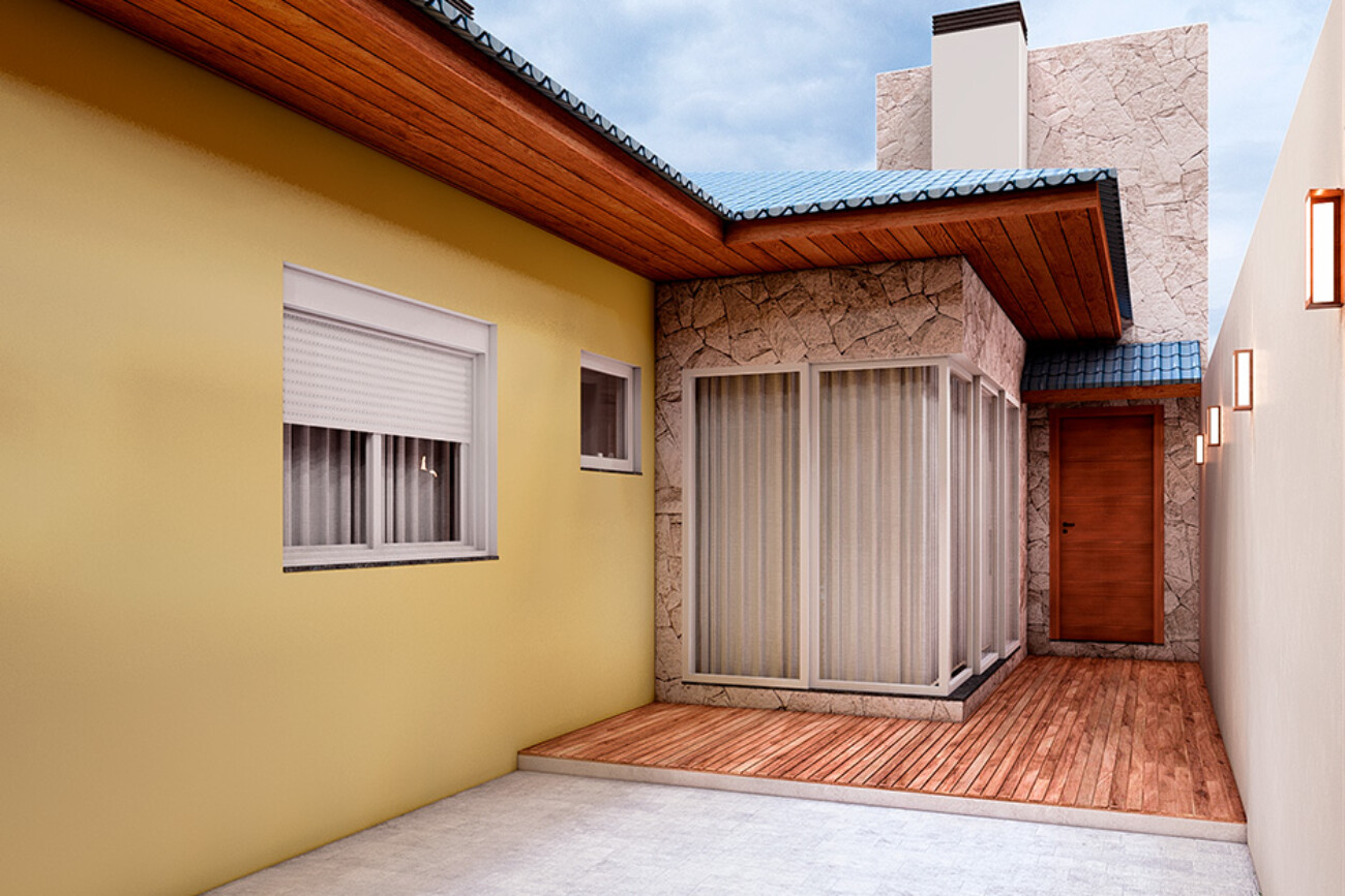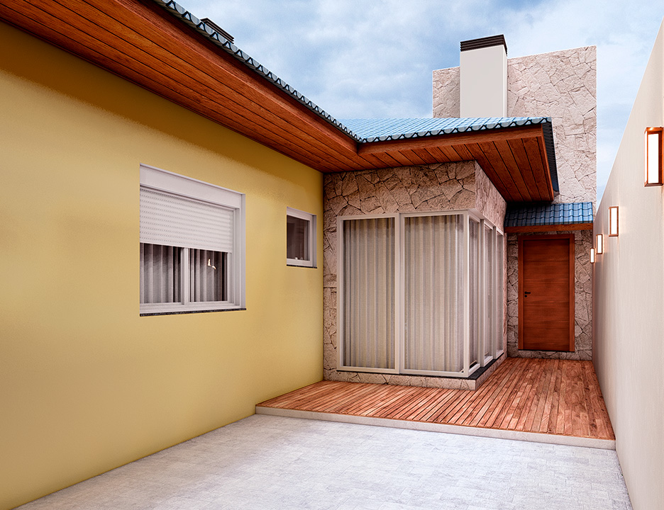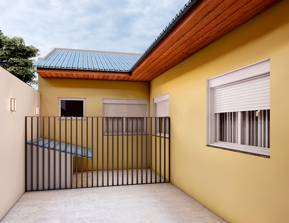 Além disso, a fachada frontal deveria ser discreta. Portanto, projetamos todas as aberturas dos dormitórios e área social para o pátio dos fundos, trazendo mais privacidade e conforto.